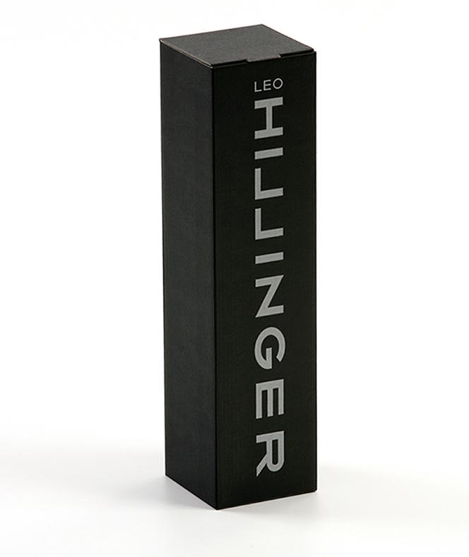 Schwarzer Geschenkkarton für eine Flasche. Stabile Pappe mit Leo HILLINGER Logo.